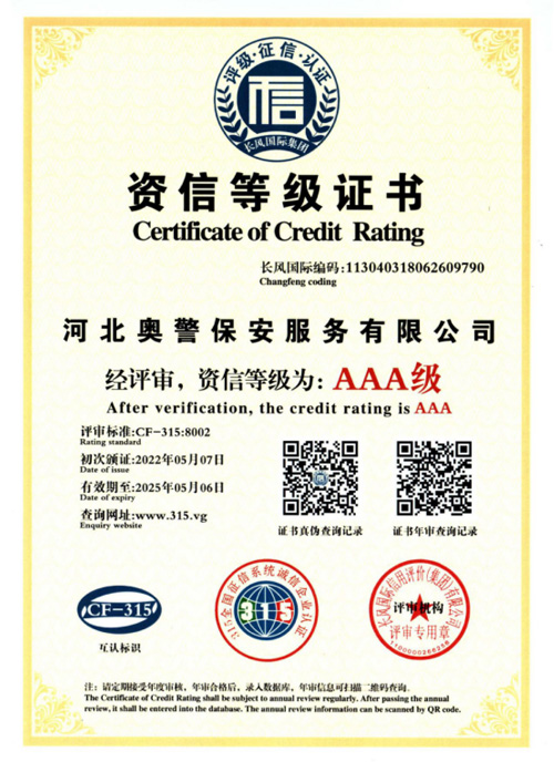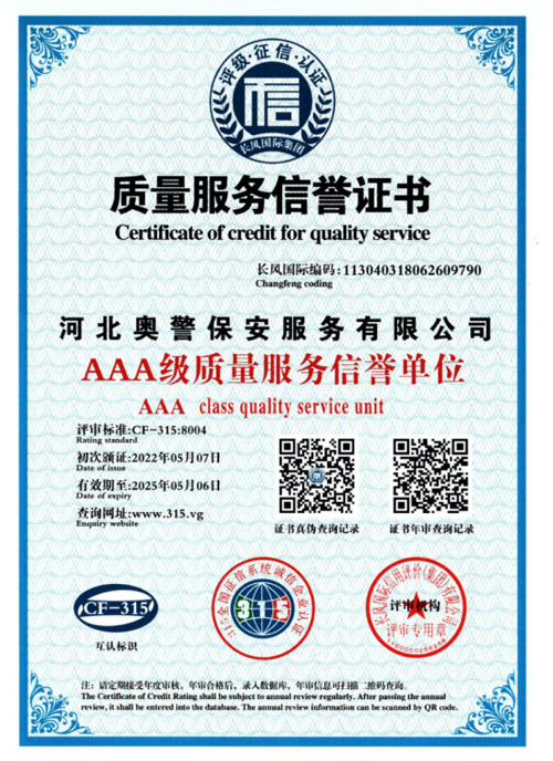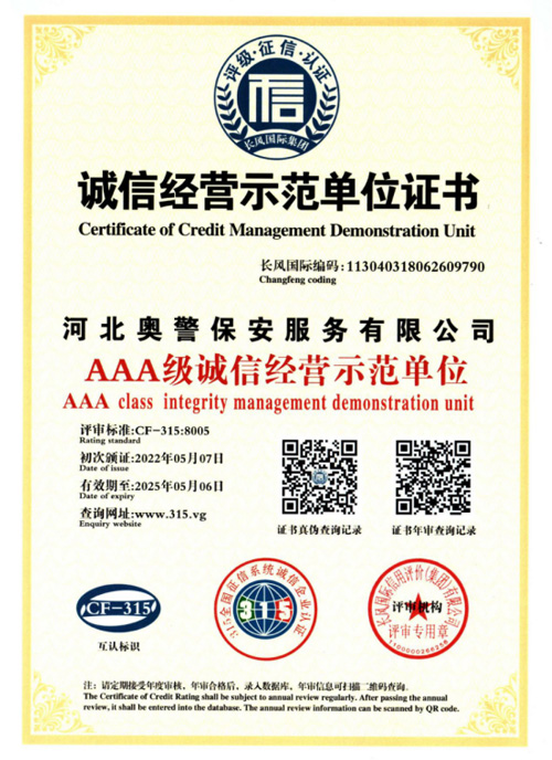 奧警邯鄲保安公司是一家民營(yíng)保安服務(wù)公司,工商行政管理局登記注冊(cè),獲取相關(guān)等級(jí)資質(zhì)證書(shū),是一家大型的保安連鎖服務(wù)公司。